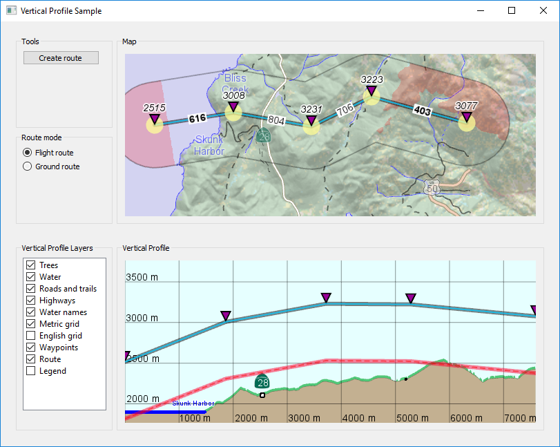 The VerticalProfileOperator generates a vertical profile of a corridor along a route, cutting through both raster and vector data sources. The resulting profile view constitutes a separate Carmenta Engine map, making it easy to apply the same visualization to the profile as the 2D and 3D maps.