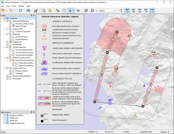 The VerticalClearanceOperator complements the vertical profile functionality by calculating the terrain and obstacle clearances of a corridor along a route. The result of the clearance calculation can be visualized as overlays in a 2D map, e.g. to provide decision support during mission planning.