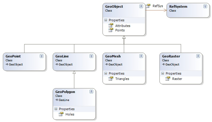 The GeoObject base class held a collection of points that were used in different ways by all the subclasses. For example, in a GeoPolygon they defined the outline while the holes were a part of the GeoPolygon class and in a GeoRaster it was assumed the list contained two points that defined the corner points in the bounding rectangle of the raster.